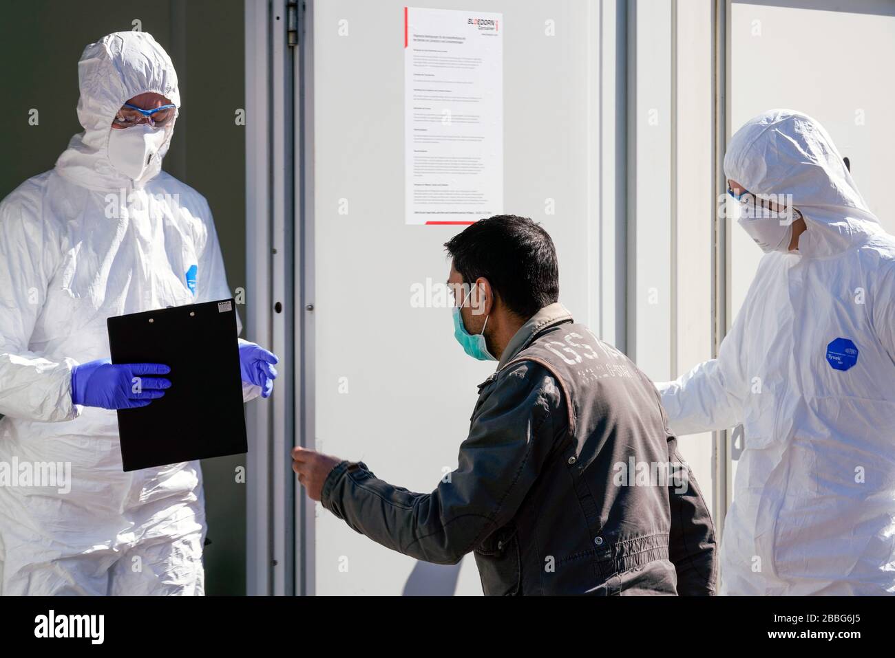 Dortmund 31 3 2020 Am Klinikum Nord In Dortmund Gibt Es Ein Corona Testzentrum In Zelten Und Containern Konnen Menschen Auf Das Virus Untersucht Werden Foto Arzte Und Mitarbeiter In Schutzkleidung Stehen Bereit Einen Corona Test