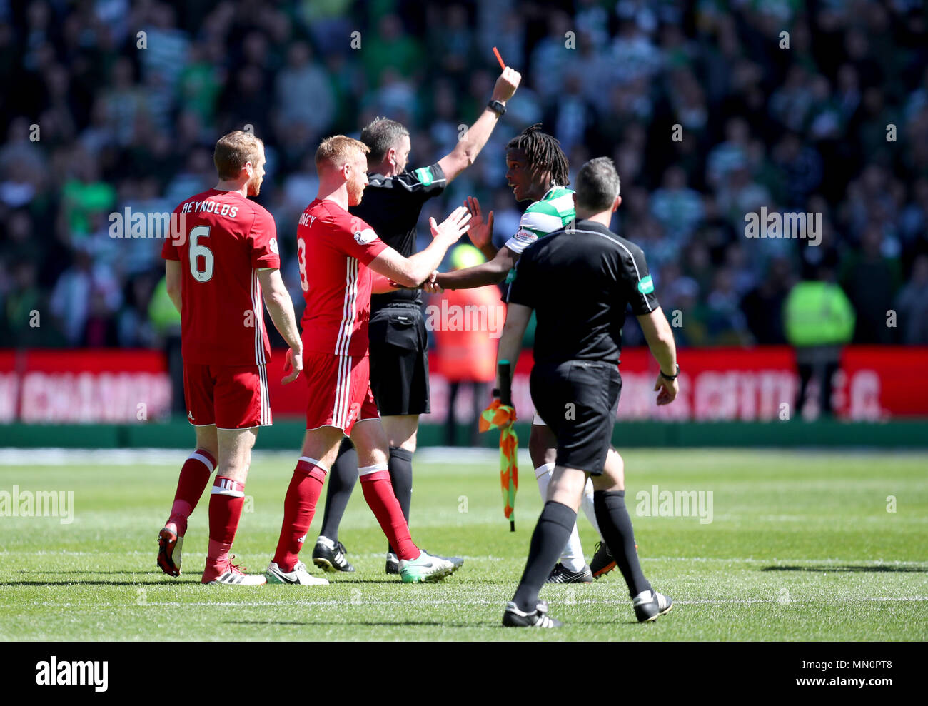 Schiedsrichter Craig Thomson Zeigt Die Rote Karte Gegen Aberdeen Shay Logan Nachdem Der Letzte Nach Der Ladbrokes Scottish Premier League Spiel Im Celtic Park Glasgow Pfeifen Stockfotografie Alamy